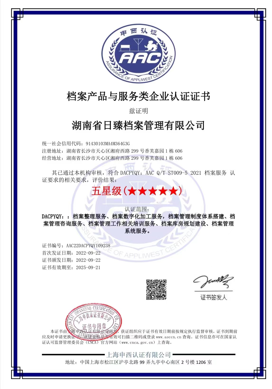 档案产品与服务类企业认证证书
