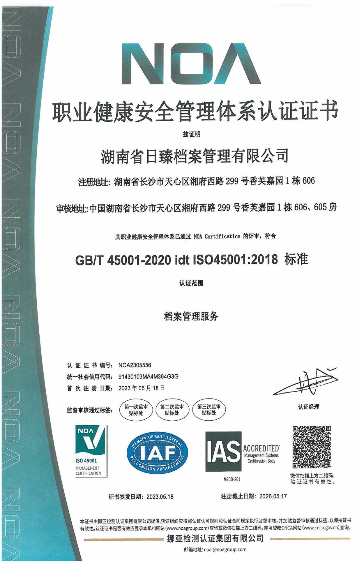 职业健康安全管理体系认证证书