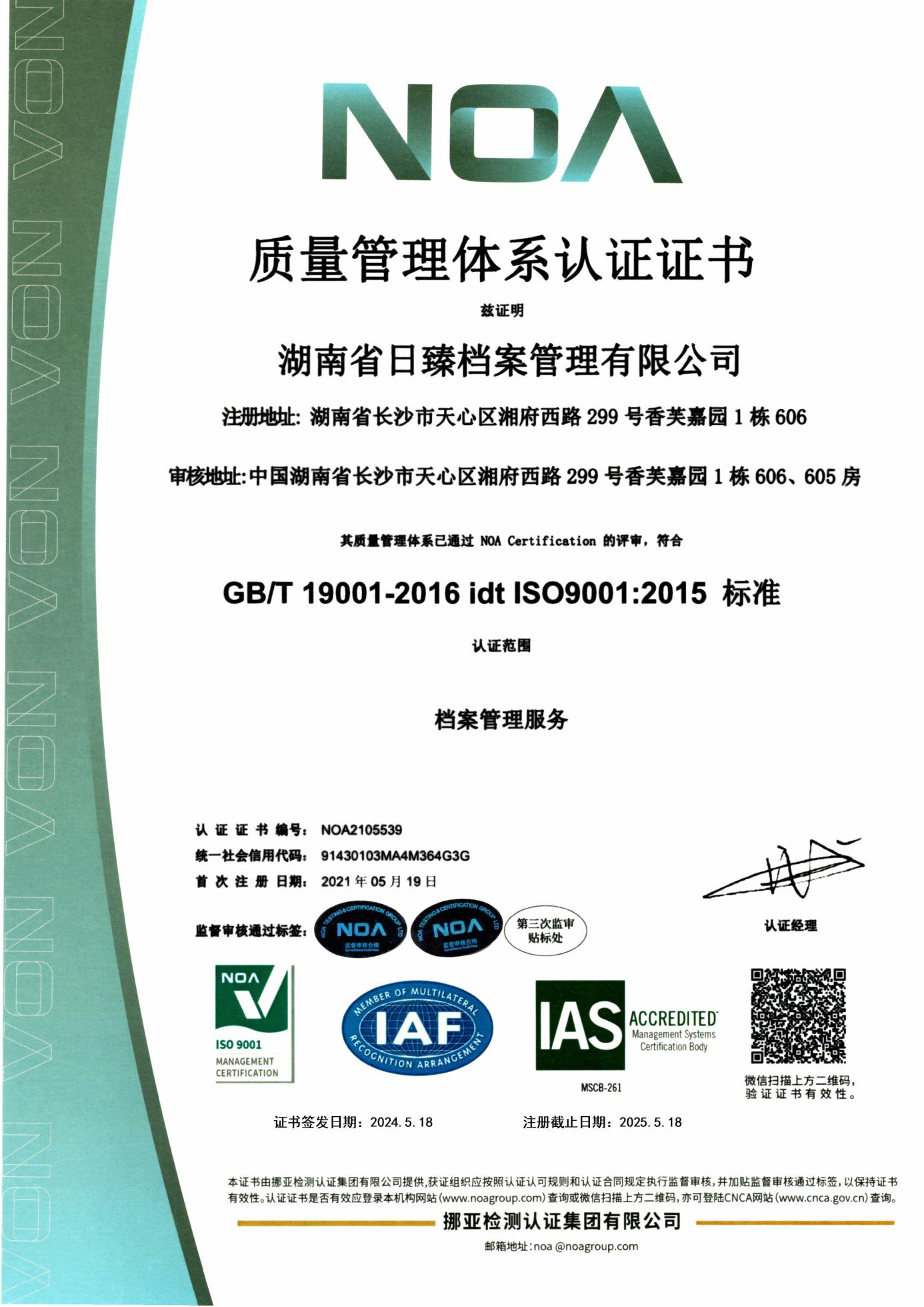 质量管理体系认证证书